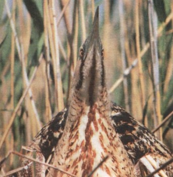При опасности выпь вытягивает длинную шею и поднимает клюв
