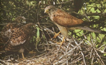Пустельга обыкновенная (самец у гнезда с птенцами)