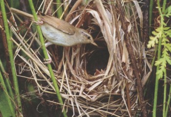 как другие камышовки, а укрепляет их на опоре из поваленных тростниковых