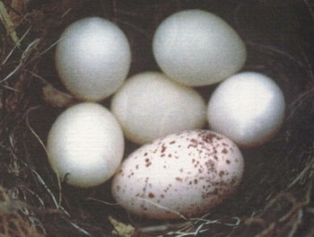 в гнездах мелких певчих птиц. Вначале она сносит 4—6 яиц с интервалом